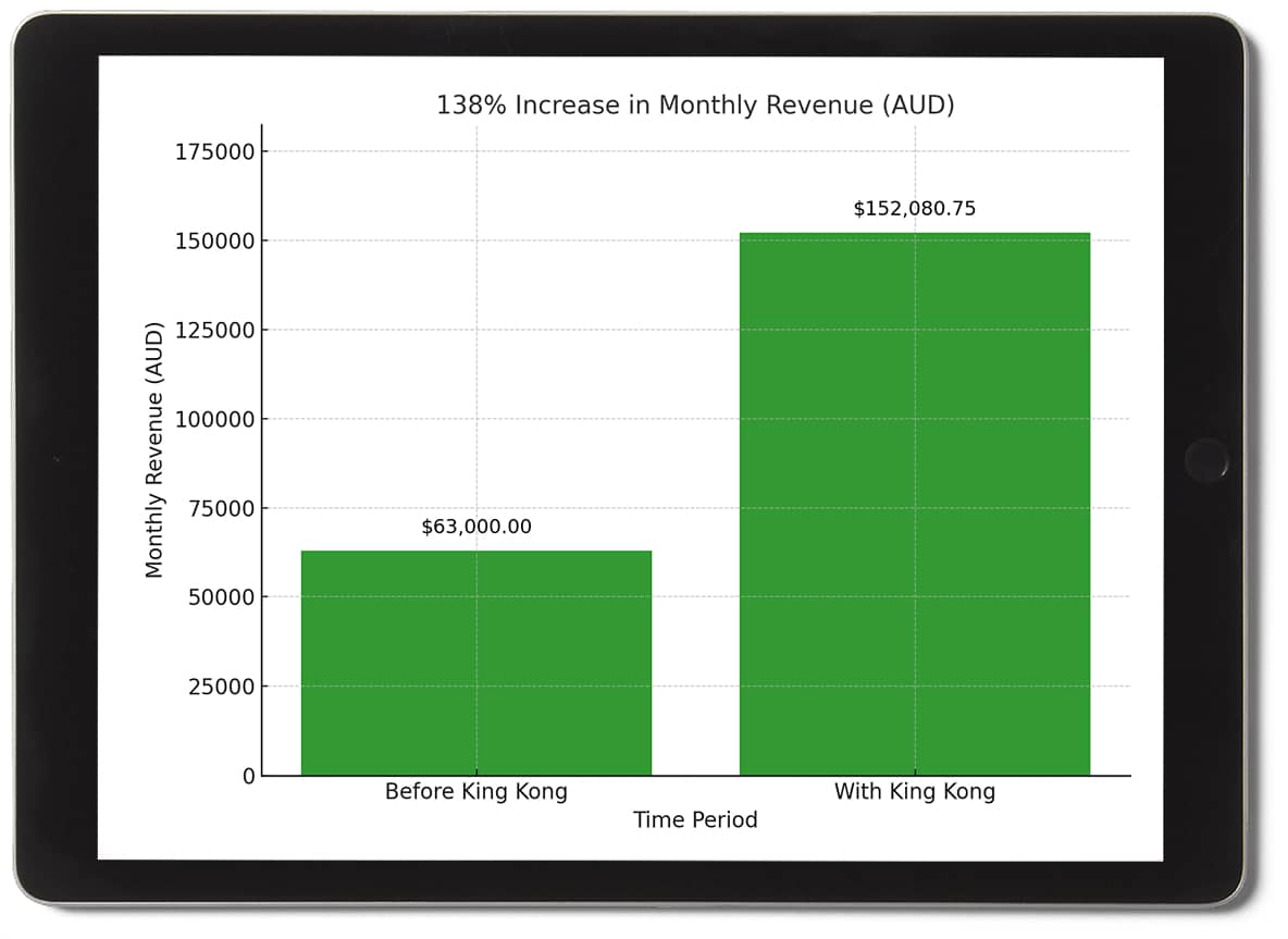 from $63k ave per month to $150,189.21 ($3,423,405.12 in revenue while partnered with King Kong)